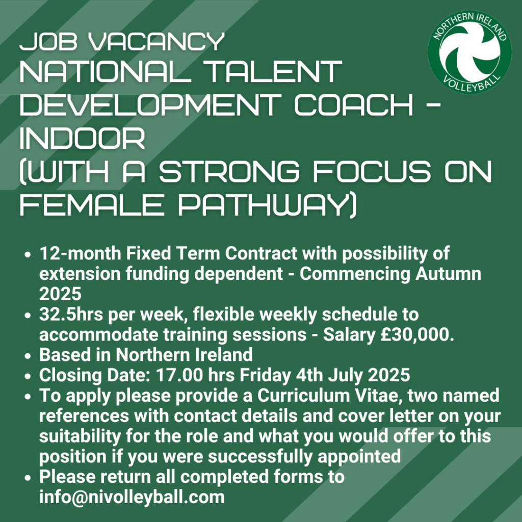 Northern Ireland Volleyball, in partnership with FIVB, is seeking to recruit a National Talent Development Coach to work alongside the National Performance Manager in planning and implementing the development of our performance pathway, athletes, squads and programmes with a focus on but not limited to, the female indoor volleyball pathway. Adding expertise, value and focus …