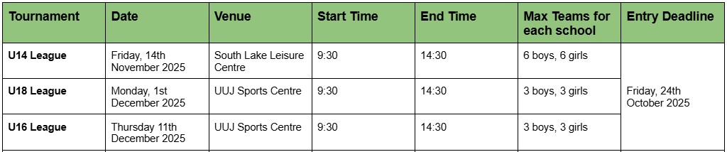 Entries are now live for this term’s School League tournaments, U14, U18 and U16 – entry form: https://forms.gle/ycKDU9VpTT3vo6yy8